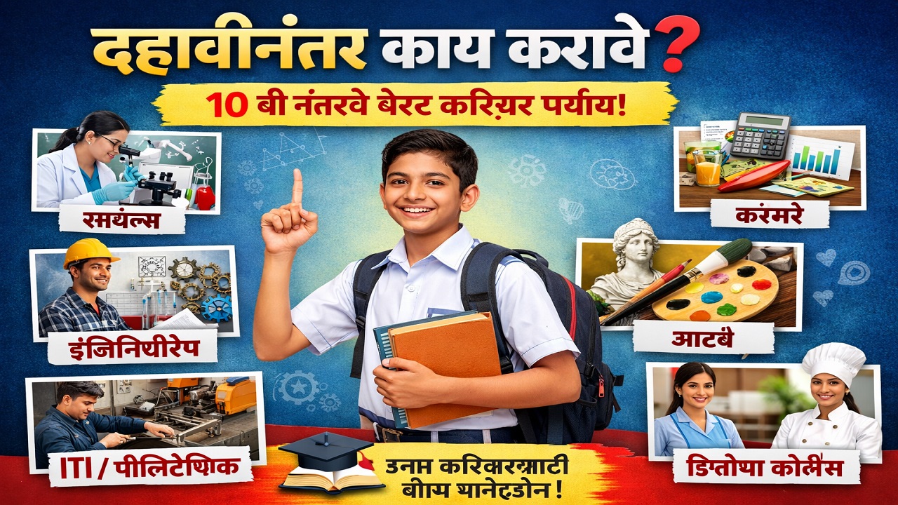 📚 करिअर मार्गदर्शन 2026 दहावीनंतर काय करावे?Best Career Options After 10th in Marathi संपूर्ण माहिती मराठीत — Science, Arts, Commerce, ITI, Diploma & Vocational Courses वाचण्याची वेळ: ८ मिनिटे अपडेट: मार्च २०२६ Expert Verified दहावी म्हणजे आयुष्यातील एक महत्त्वाचा टप्पा. या वेळी योग्य निर्णय घेतला तर भविष्य उज्ज्वल होऊ शकते. या लेखात आपण सर्व प्रमुख … Read more